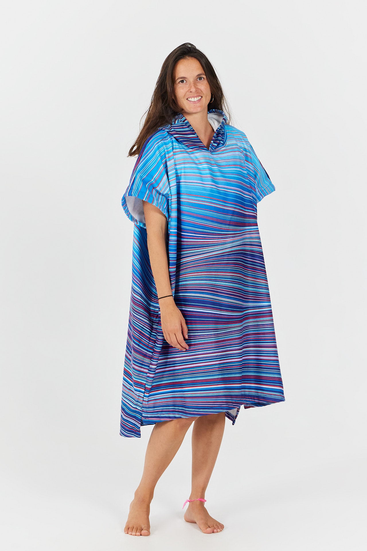Der Poncho besteht aus 100 % Polyester und ist leicht, wodurch das Design durch Sublimation besonders gut zur Geltung kommt. Dank seines Oversize-Schnitts und der großen Seitenschlitze lässt er sich leicht anziehen, während das Futter aus 100 % Baumwollfrottee und die großzügige Kapuze nach dem Surfen, Schwimmen oder anderen Wassersportaktivitäten für Wärme und Weichheit sorgen.