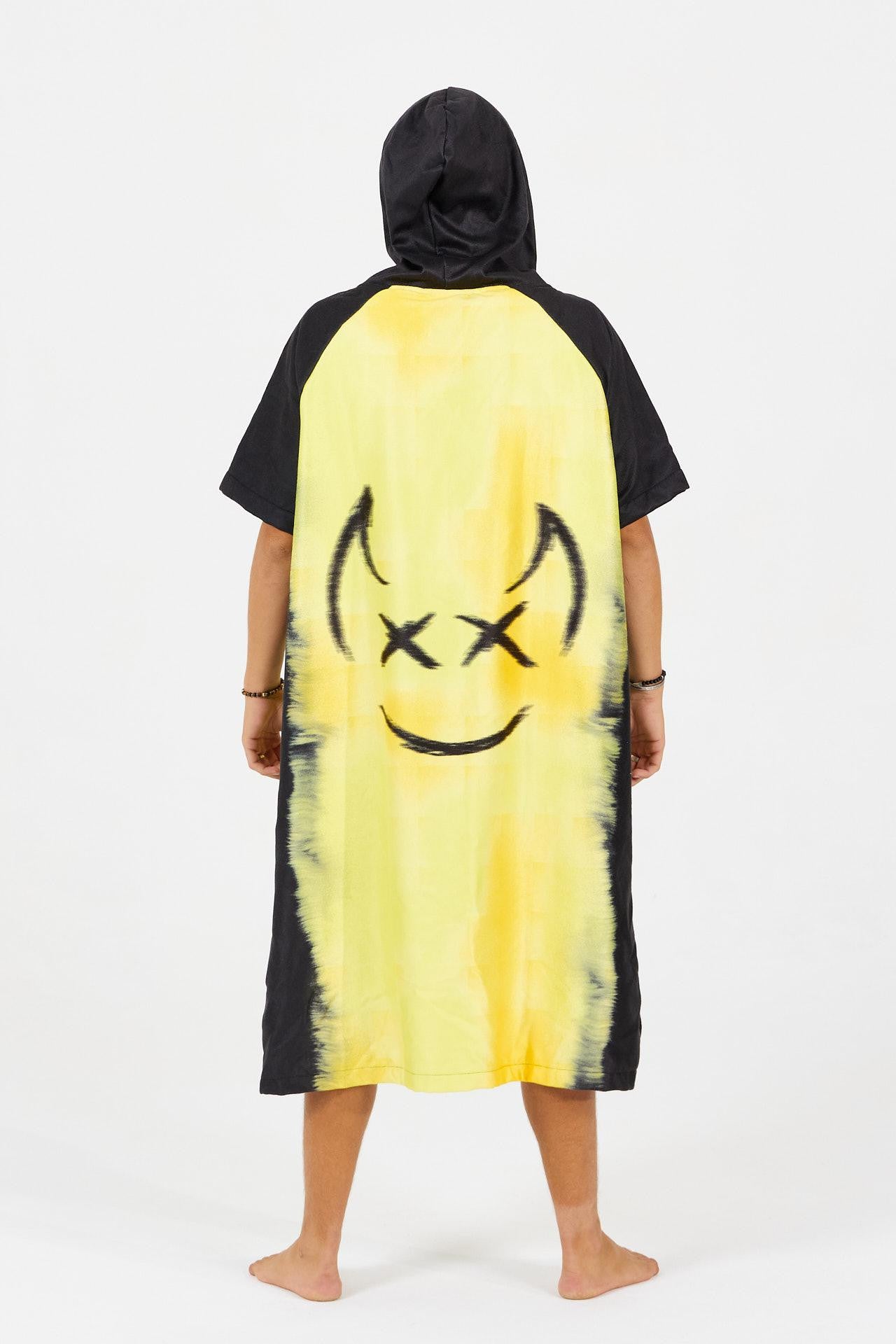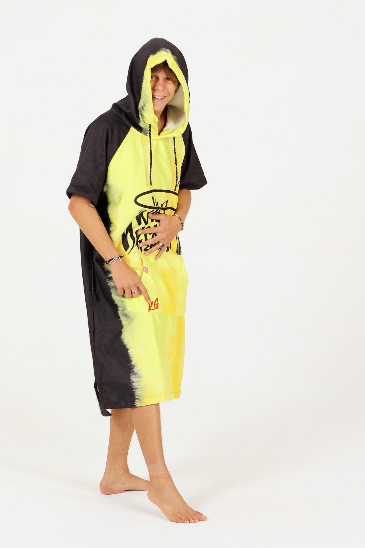 Mit einer Kängurutasche für Wax und Finnen, einer großen Kapuze, die zwischen zwei Sessions auf den radikalsten Spots trocken und warm hält, spiegelt dieser Poncho Kyllians Persönlichkeit wider: farbenfroh und voller Einsatz.