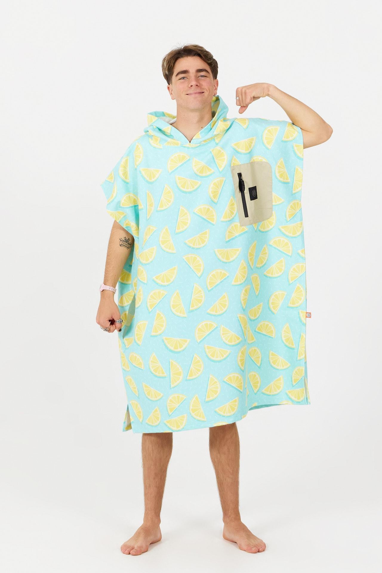 Gefertigt aus angenehm weichem Frotteestoff bietet der Lemon Poncho nicht nur ein sanftes Gefühl auf der Haut, sondern auch eine außergewöhnliche Saugfähigkeit – ideal, um dich nach dem Baden oder einer Surf-Session schnell abzutrocknen. Bedruckt mit köstlichen Zitronen, die sonnige Tage heraufbeschwören, verleiht dir dieser Poncho bei deinen Strandabenteuern einen frischen und fröhlichen Look. Und wenn es ins Wasser geht, kannst du ganz entspannt bleiben: Deine Schlüssel und dein Handy sind sicher in der wasserdichten, zipbaren Ripstop-Brusttasche verstaut.