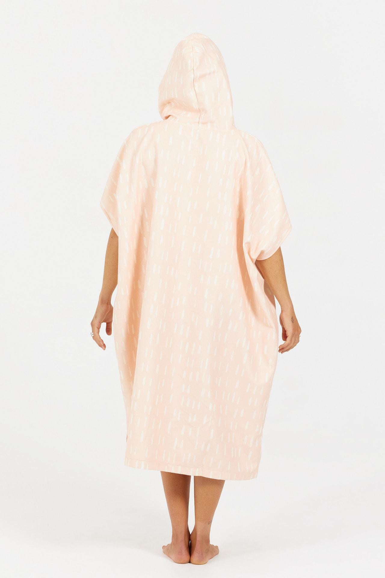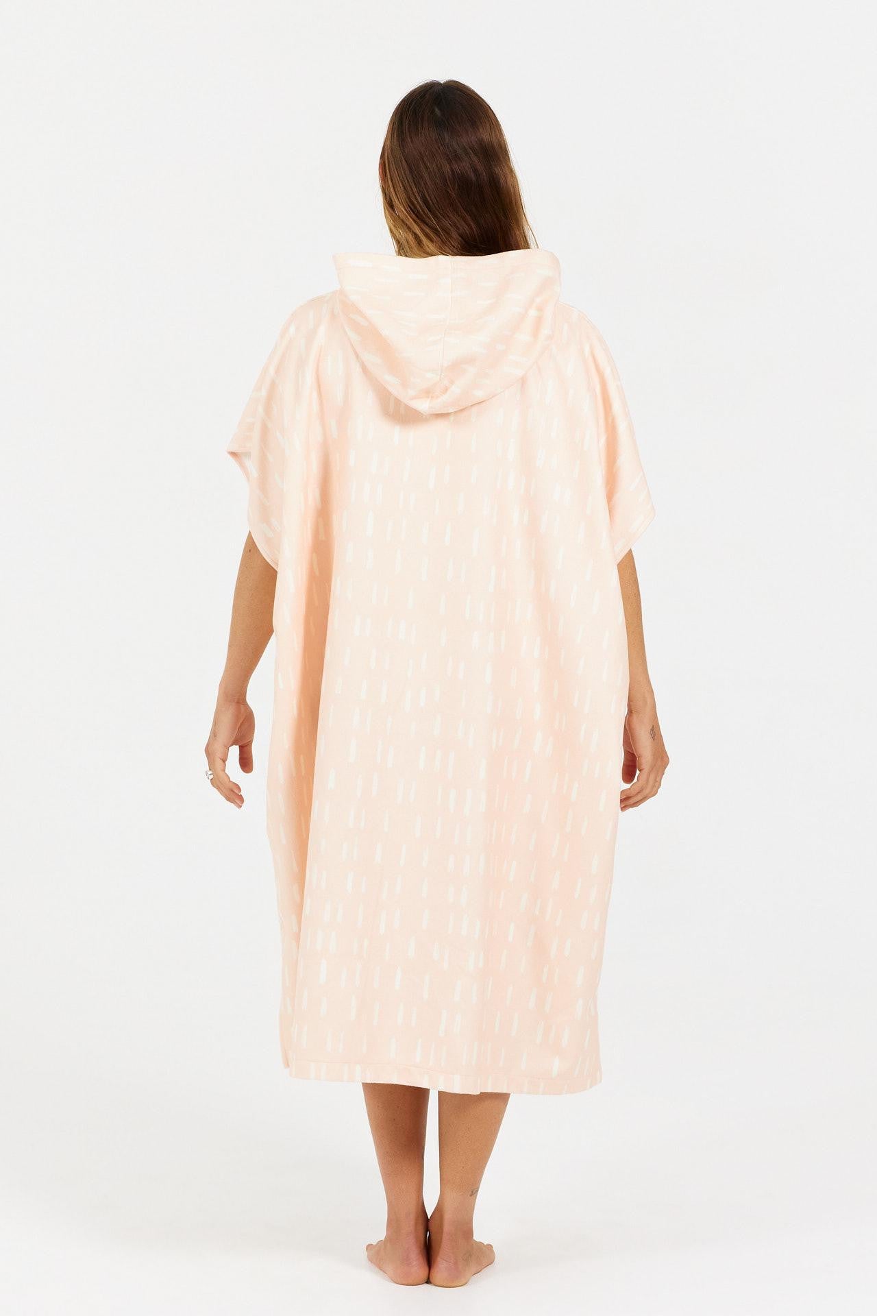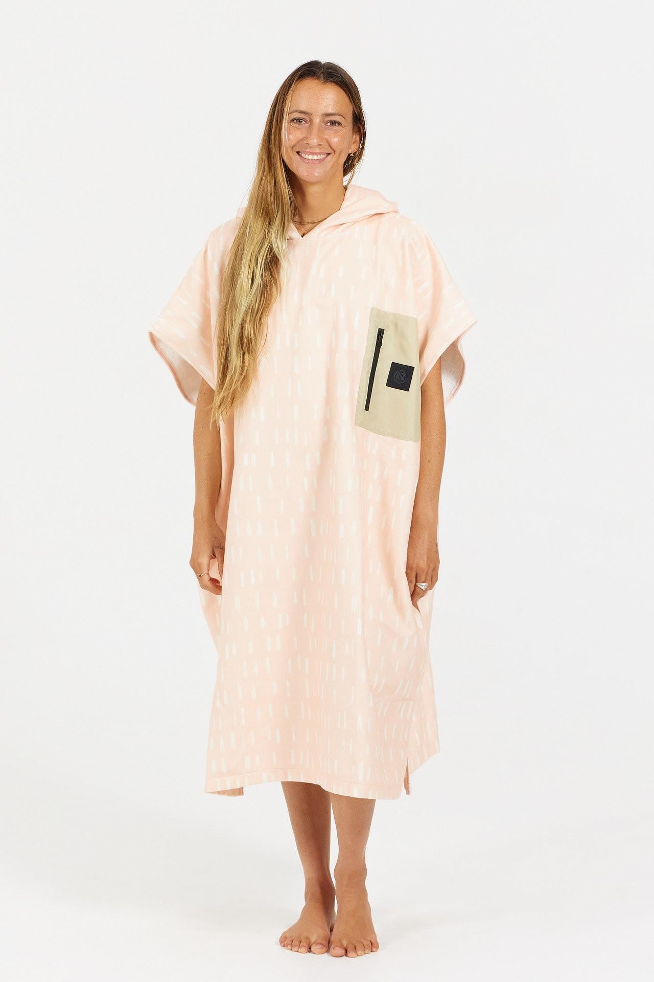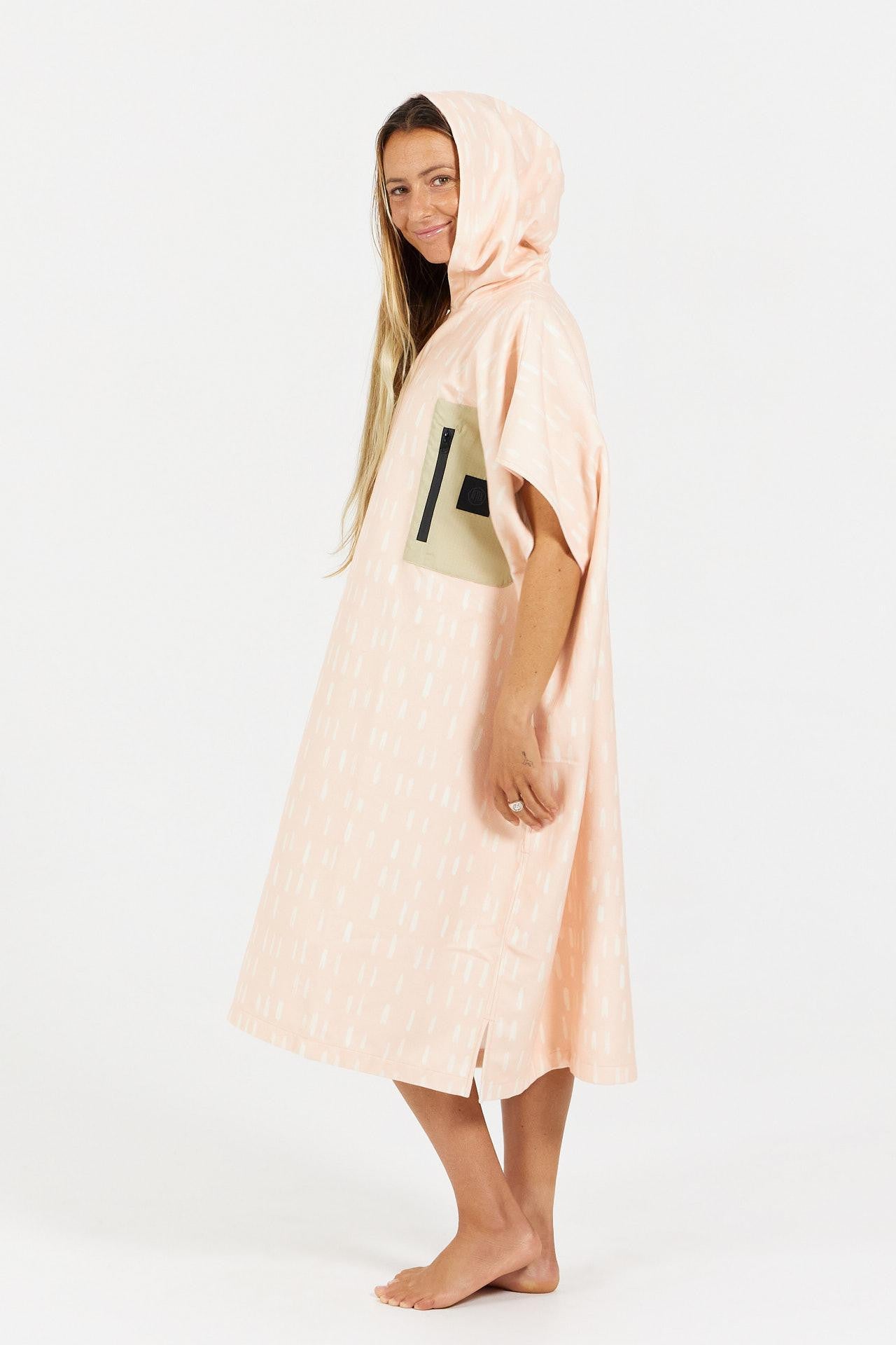 Der Tech Pocket Tears of Pink Poncho zeigt einen zarten All-over-Print aus kleinen, stilisierten Tropfen auf einem hellen, pudrigen Rosaton, der Sanftheit und Eleganz ausstrahlt. Gefertigt aus ultra-absorbierendem Frotteestoff sorgt er für schnelles Trocknen nach dem Baden oder einer Surf-Session. Die wasserdichte, zipbare Brusttasche aus Ripstop-Material bietet optimalen Schutz, um kleine Gegenstände vor Feuchtigkeit zu bewahren. Funktional, komfortabel und raffiniert – dieser Poncho ist ideal vor und nach euren Wassersportaktivitäten, ob im Meer oder im Schwimmbad.