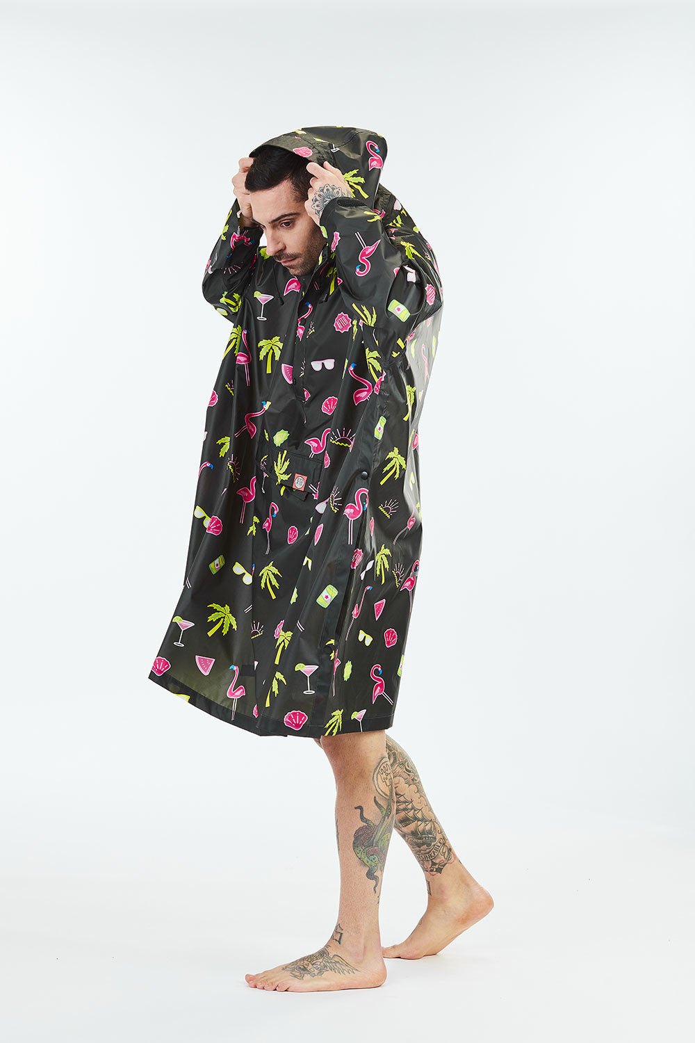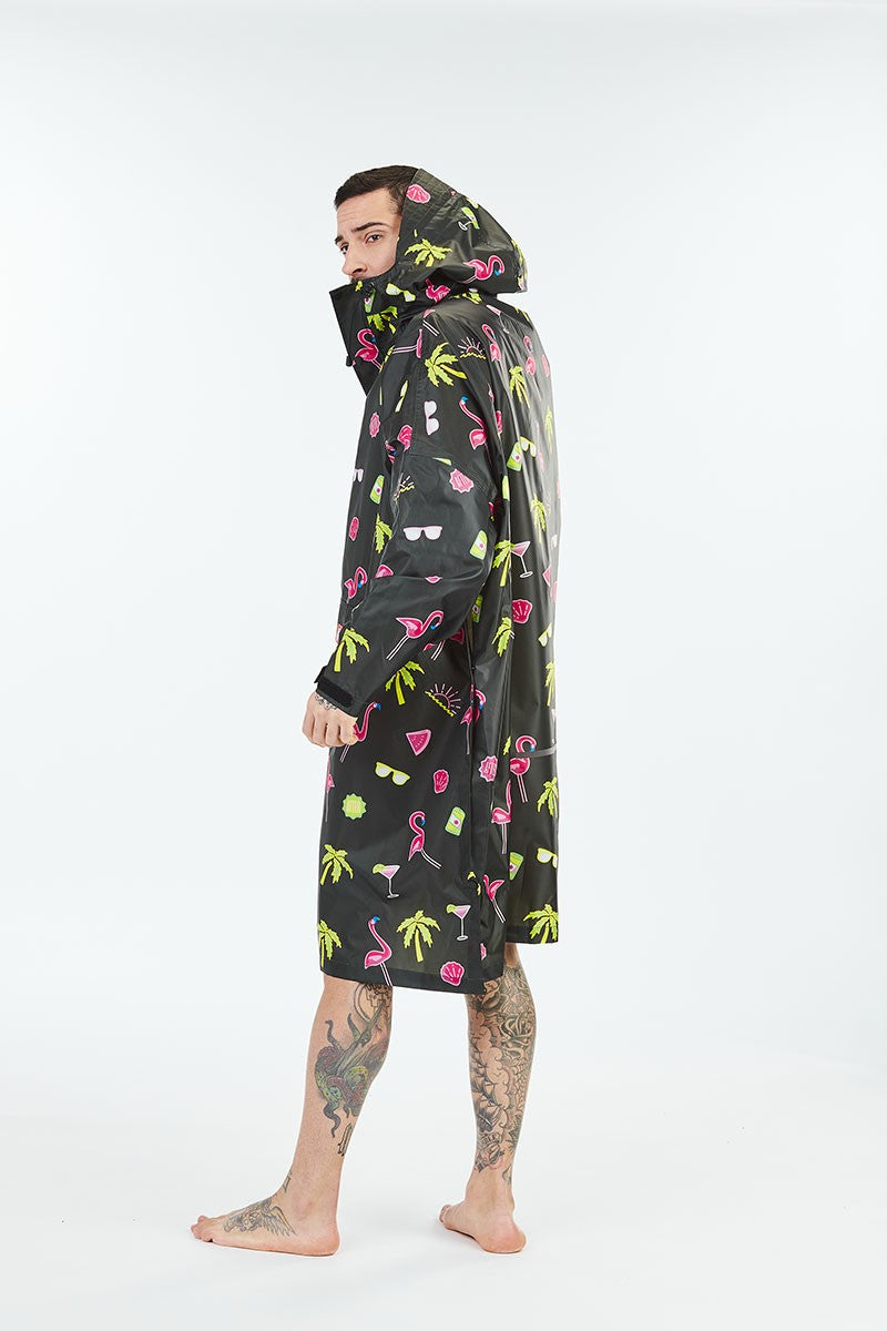Sich im Regen zu amüsieren ist möglich! Dieser Paradise-Poncho ist unsere Interpretation des Paradieses: Cocktails, Palmen, Flamingos … und natürlich die Sonne. Perfekt, um gute Vibes mit allen zu teilen, die euch damit sehen!