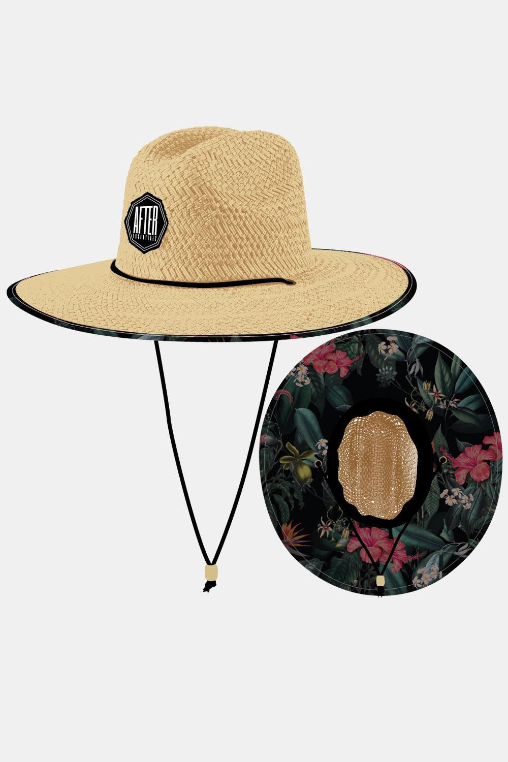 Exotische Blumen auf schwarzem Hintergrund – dieses in Zusammenarbeit mit Vaimalama entworfene Muster ist von polynesischen Einflüssen inspiriert und zeigt sich in einem schlichten und eleganten Stil. Ob am Strand oder in der Stadt: Dieser Hut schützt dich mit seiner breiten Krempe vor der Sonne und bleibt dank seiner natürlichen Fasern angenehm atmungsaktiv.